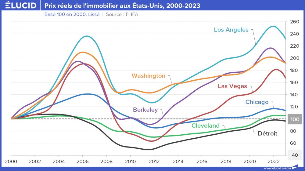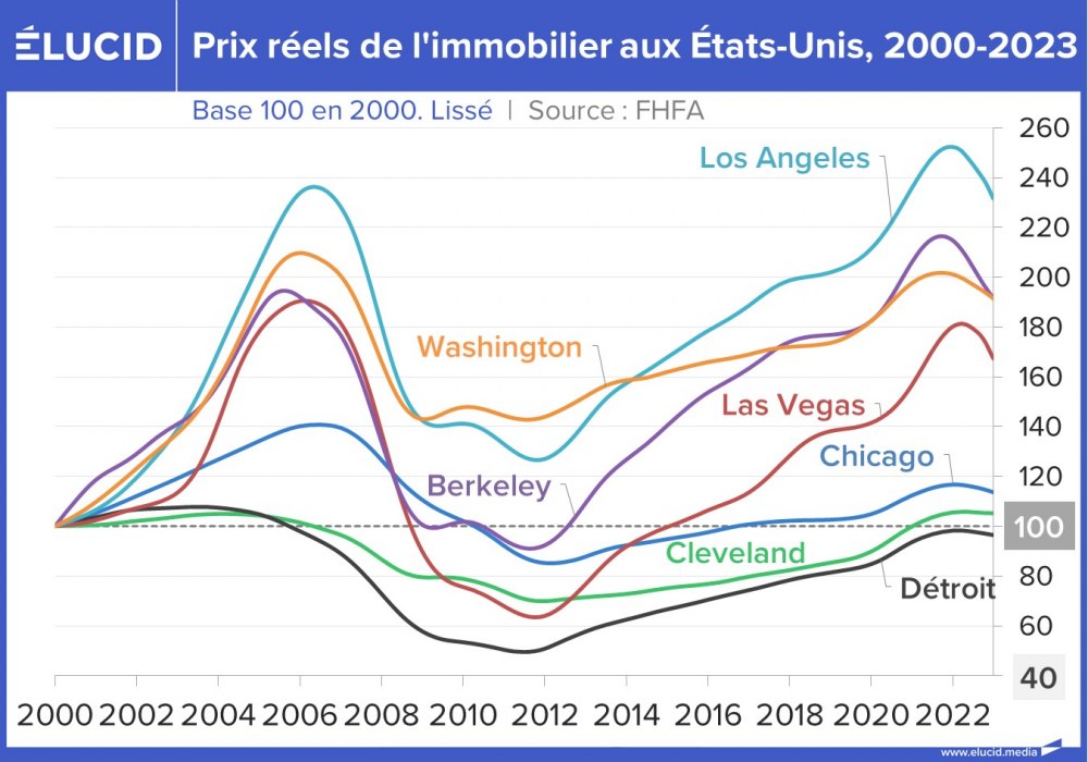 La situation reste cependant très contrastée outre-Atlantique suivant les États : les prix du logement de certaines grandes villes, en mauvaise situation économique, n’ont ainsi guère augmenté depuis vingt ans. Mais, fait notable, ils ont baissé partout en 2022.