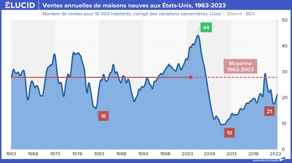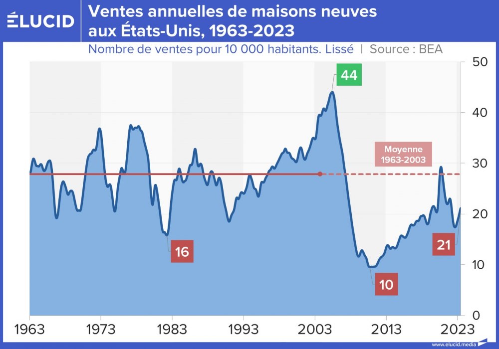 En observant les données sur le long terme et en prenant en compte la démographie, on remarque que le nombre actuel de ventes de maisons neuves reste très inférieur à son niveau moyen de la période 1963-2003, et qu’il est presque à la moitié de son niveau d’il y a 20 ans.