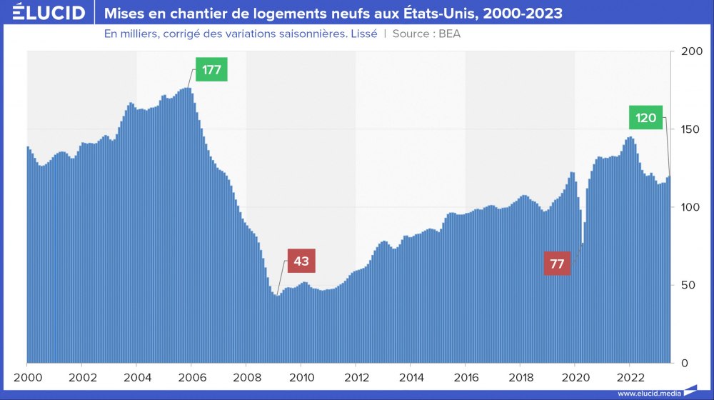 Au niveau des mises en chantier de logements neufs, on constate une baisse d’environ 20 % en 2022, mais le niveau reste dans les plus hauts depuis 15 ans : il n’y a donc pas de signe de grave crise immobilière à ce stade.