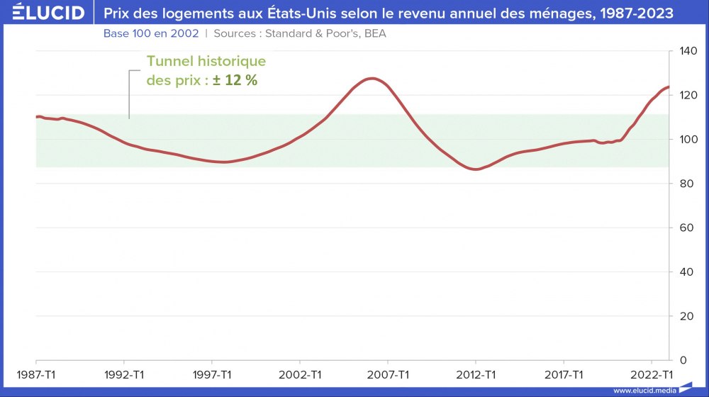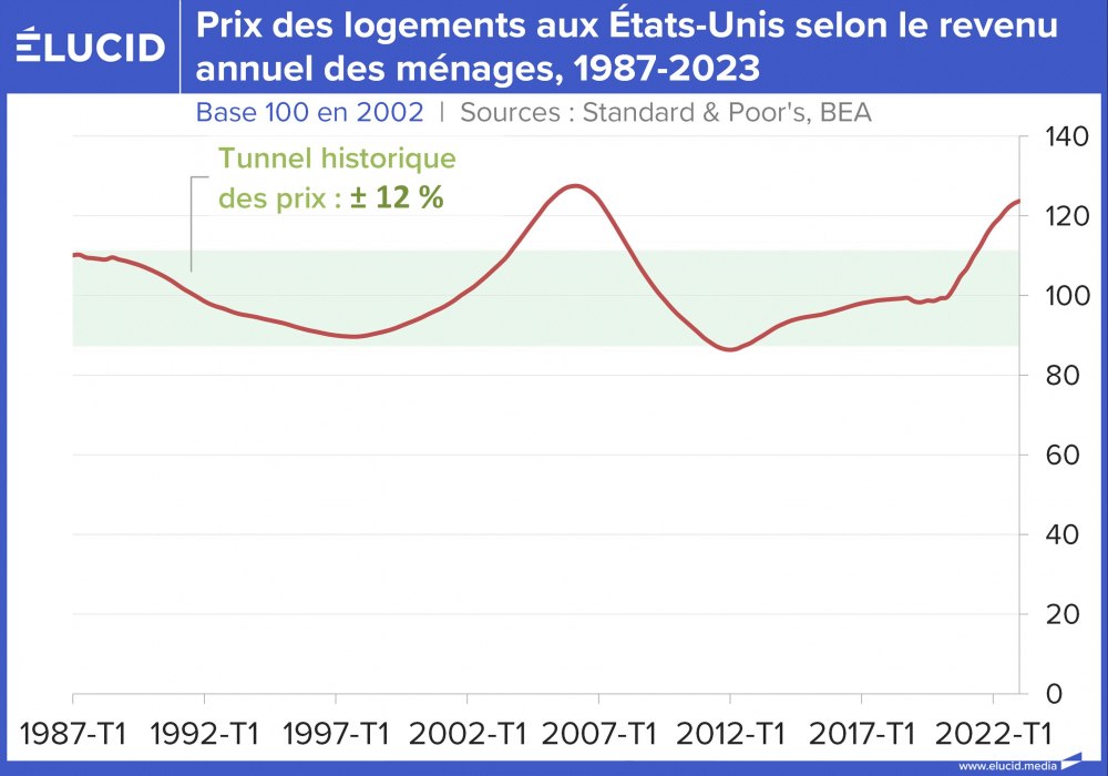 Cependant, depuis un demi-siècle, en proportion du revenu des ménages, les prix du logement apparaissent élevés, en dehors de leur tunnel historique récent. Avec +25 % par rapport au niveau moyen, la situation américaine est cependant bien meilleure qu’en France, où les prix sont supérieurs de près de 100 % au niveau moyen historique, c'est-à-dire deux fois plus chers !