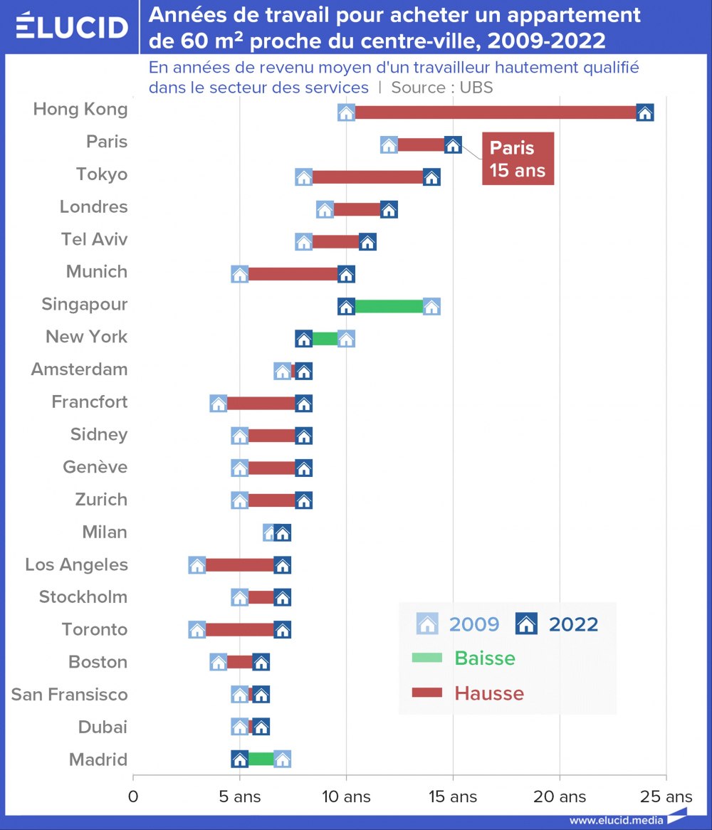 Sur le graphique ci-dessous, on a représenté l’évolution du nombre d'années de travail nécessaires pour acheter un appartement dans certaines grandes villes (2012-2022). Les chiffres sont sans appel : Paris détient la médaille d'argent de la ville la plus chère au monde, juste après Hong-Kong.