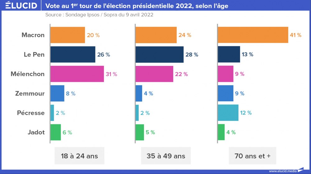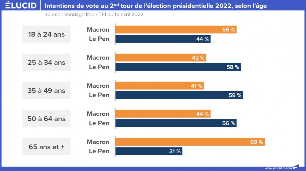 Concernant l'âge, Le Pen gagne sur l'ensemble constitué des 18-64 ans (pas sur les seuls 18-24 ans, mais c'est probablement parce qu'ils n'ont pas encore été confrontés aux ravages du néolibéralisme). Si Macron gagne, il le devra à l'électorat des retraités et à sa forte mobilisation.