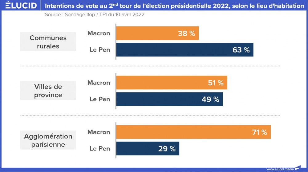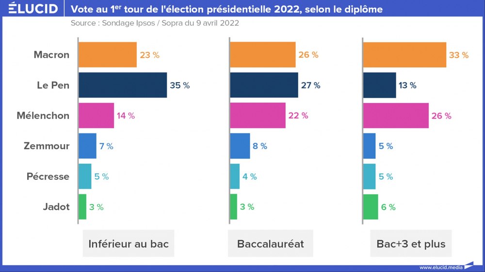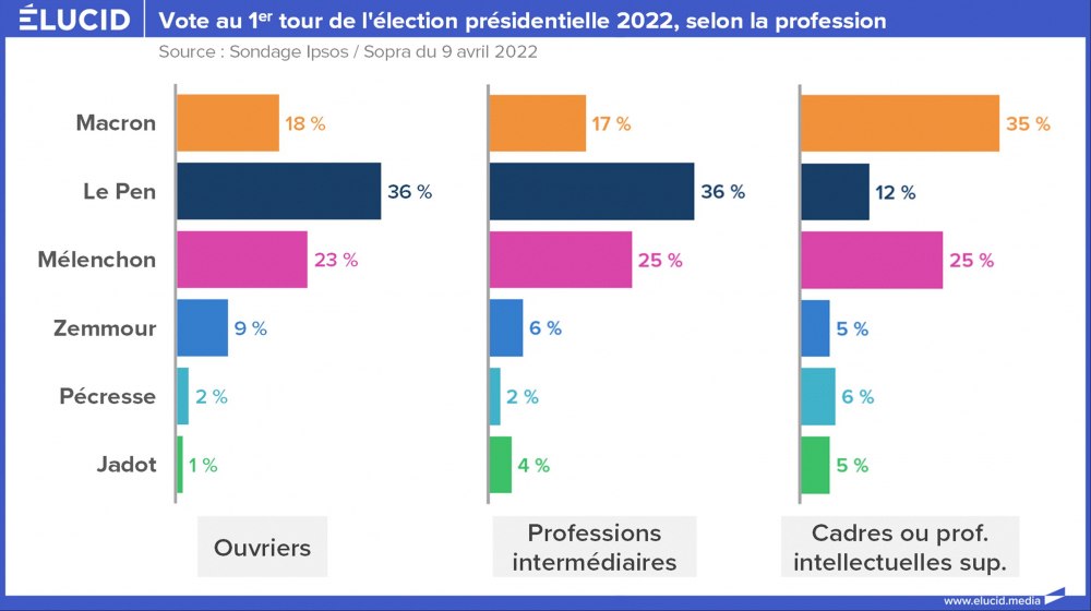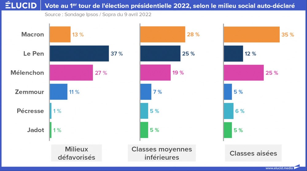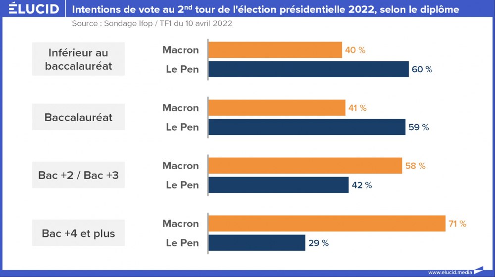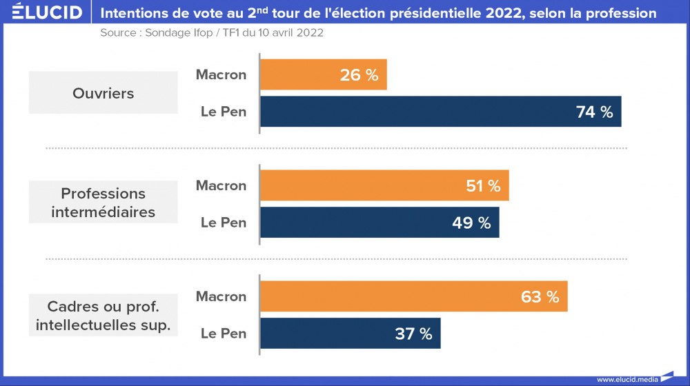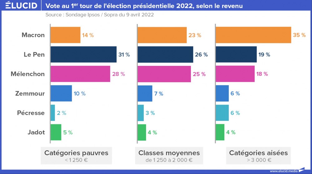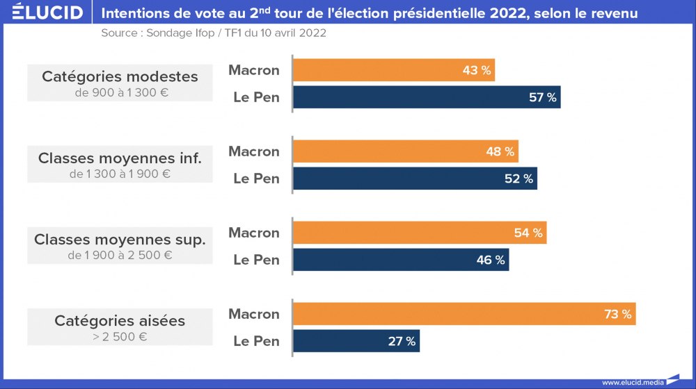 L'électorat est également fractionné au niveau des revenus : les personnes gagnant moins de 2 000 € par mois votent Le Pen, les autres élisent Macron.