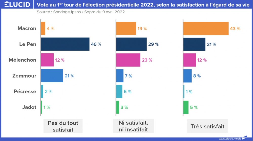 L'axe d'analyse de la satisfaction est un des plus importants : Macron est le candidat des gens heureux, Le Pen celle des gens malheureux, et Mélenchon celui des personnes "ni heureuses ni malheureuses".
