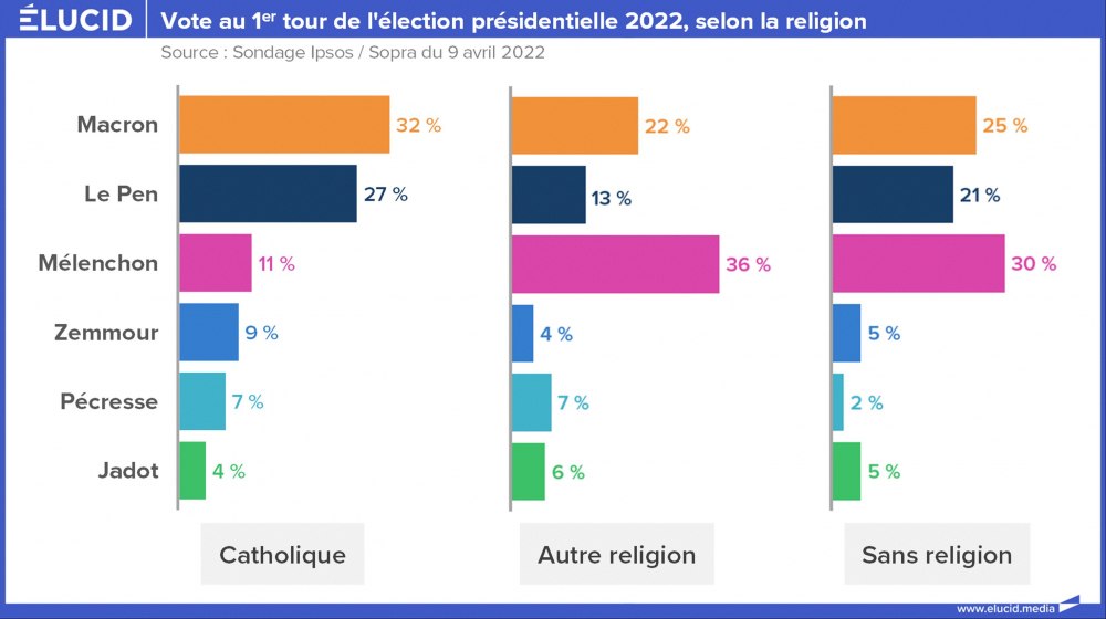 On observe enfin un vote Macron et Le Pen croissant un peu avec la religiosité, et un vote Mélenchon majoritaire (relativement) chez les athées et, essentiellement, les musulmans.