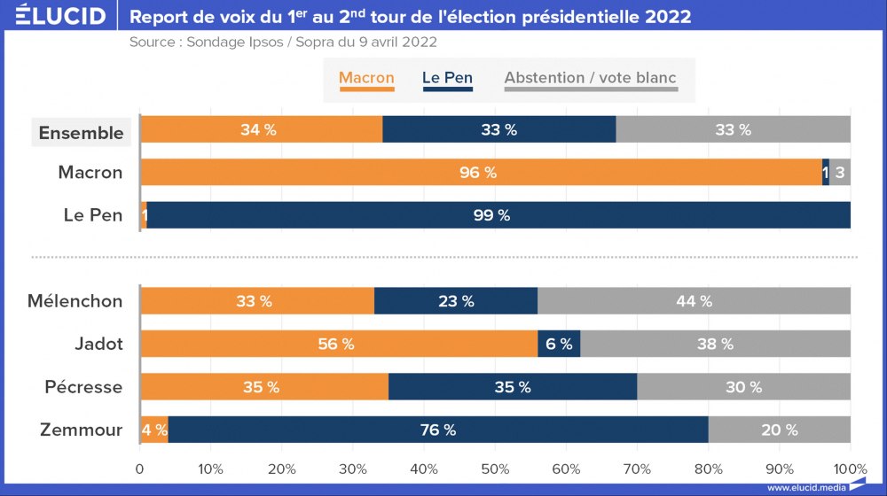 Concernant les reports de voix pour le second tour, on observe un éclatement des choix pour Pécresse et Mélenchon, les électeurs Zemmour soutenant Le Pen.