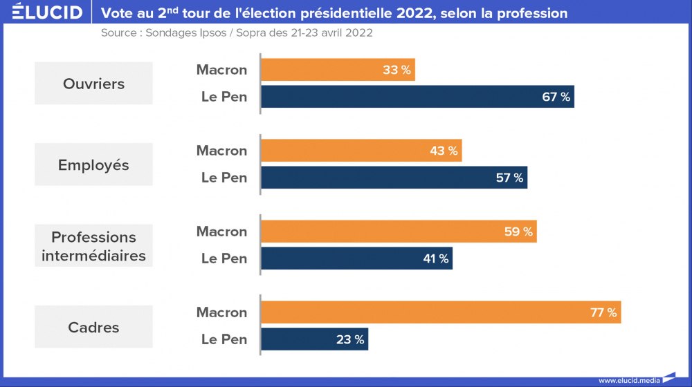 Fortement corrélée aux points précédents, l'analyse suivant la profession montre qu'il y a eu deux fois plus d'ouvriers votant Le Pen que Macron, et trois fois plus de cadres votant Macron que Le Pen.