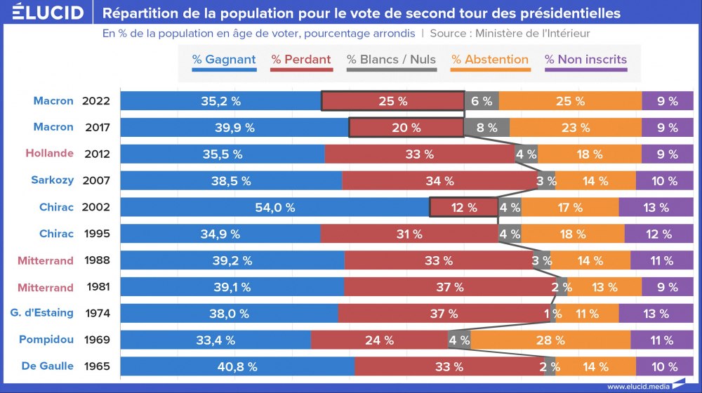 On note que, contrairement aux États-Unis par exemple, on ne s'intéresse jamais aux personnes qui ne sont pas inscrites sur les listes électorales, et qui s'abstiennent généralement depuis de nombreuses années : elles pèsent pourtant près de 10 % du corps électoral. Si on en tient compte, on observe que Macron n'a obtenu les voix que d'un gros tiers des personnes de plus de 18 ans, Le Pen et l'abstention représentant chacune un quart des citoyens.
