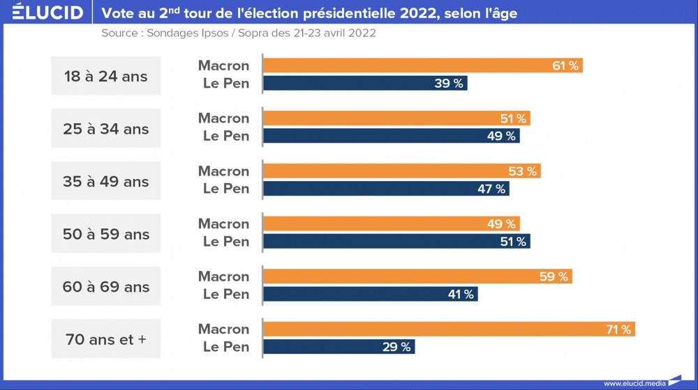 L'âge a de nouveau joué un fort rôle : les actifs ayant voté pratiquement à égalité pour les deux candidats, et les inactifs ayant donné 60 à 70 % de leurs voix à Macron (soulignons toutefois que les très jeunes se sont fortement abstenus, à 40 %, contre 15 % pour les plus âgés).