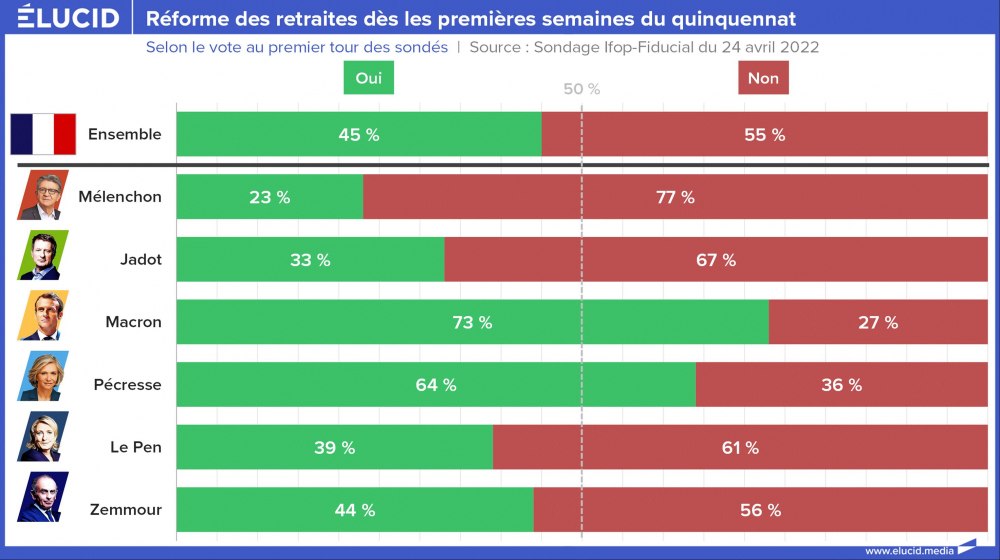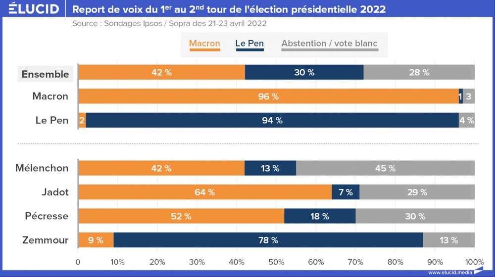 Les reports de voix sont conformes aux prévisions : la majorité des électeurs de Pécresse et Jadot ont voté Macron, et une majorité relative des électeurs de Mélenchon se sont abstenus.