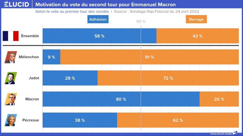 L'analyse des motivations du vote montre à quel point le vote Macron a été extorqué à beaucoup de personnes, puisque seuls 60 % de ses électeurs ont voté par adhésion au programme Macron.