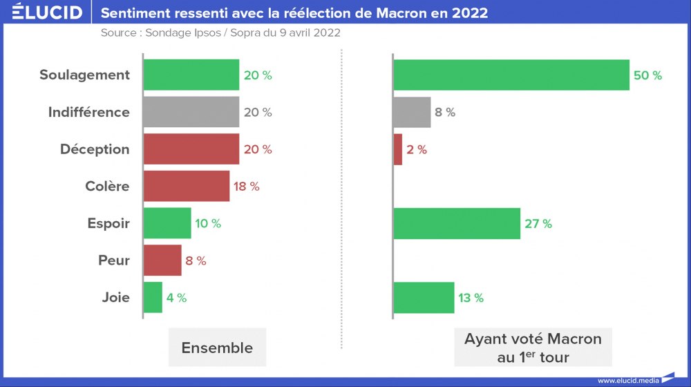 On observe ainsi que seul un tiers des François éprouve un sentiment positif avec l'élection de Macron, alors que la moitié a des sentiments négatifs. Et même chez les électeurs de Macron du premier tour, l'enthousiasme n'est pas débordant...