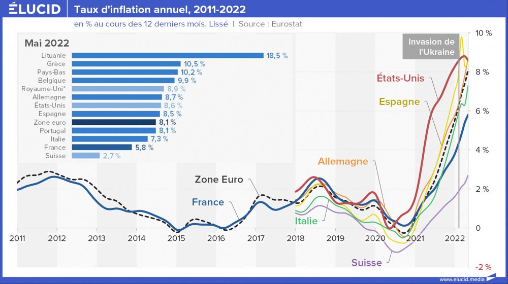 2 %, 4 %, 6 %, 8 % : depuis le printemps 2021, l’Occident est confronté au retour d’une inflation carabinée, comme nous l’avons vu dans ces quatre articles (1, 2, 3, 4).