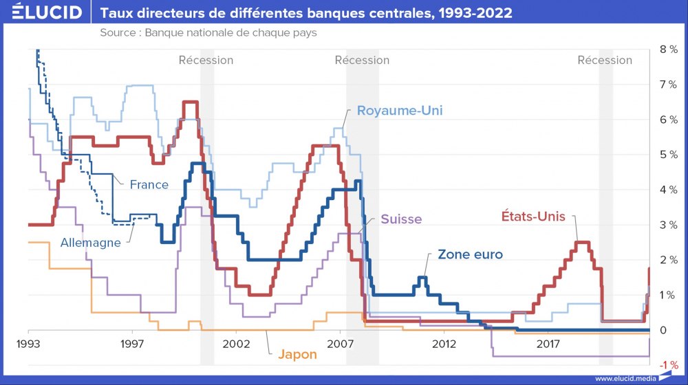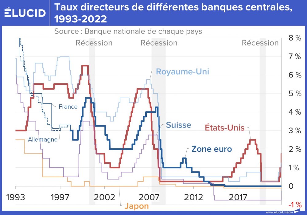 Rappelons que ces taux directeurs sont fondamentaux pour l’économie : ils fixent en fait la valeur des taux d’intérêt pour tous les emprunts d’argent à court terme (de quelques jours à quelques trimestres), et ils ont une nette influence sur les taux à long terme, servant aux investissements, par exemple pour les prêts immobiliers. Quand l’économie va mal, la banque centrale baisse ses taux, ce qui facilite les investissements et aide à relancer la croissance. Mais une économie où il y a trop d’investissements risque alors d’être confrontée à l’émergence de bulles et de poussées inflationnistes : la banque centrale augmentera alors ses taux pour diminuer l’inflation.