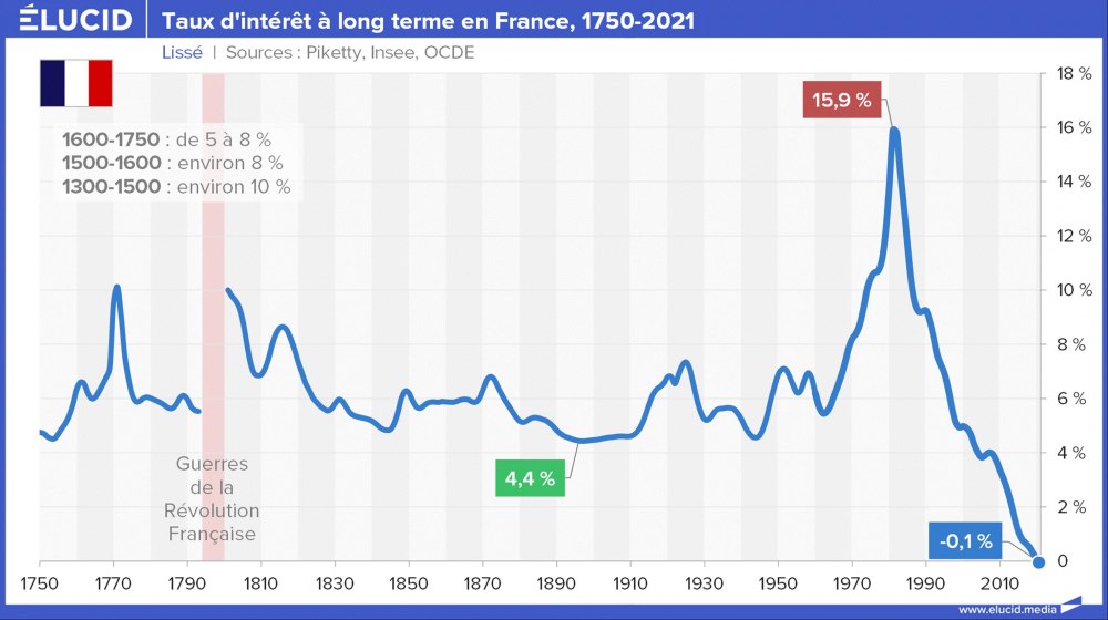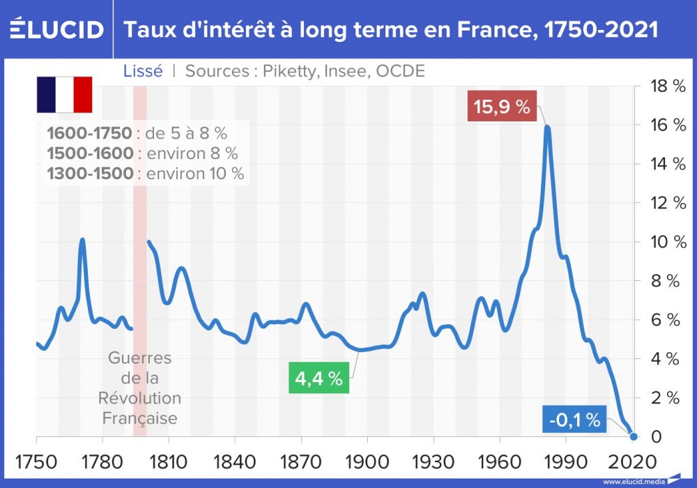 Un large recul historique permet de bien constater la période exceptionnelle que nous venons de vivre (en soulignant que les taux avant 1960 fluctuaient beaucoup moins, n’étant pas soumis à la spéculation massive de marchés financiers).