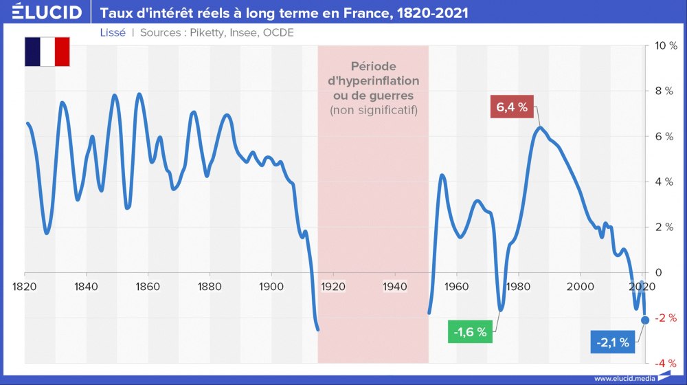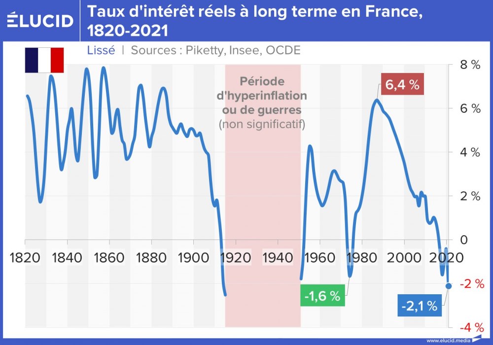 À partir du graphique précédent, on peut retracer l’historique du taux d’intérêt réels des emprunts publics, qu’on appelle parfois, bien à tort, taux « sans risque ». Il se situait à un niveau de 3 à 6 % au XIXe siècle, et de 2 % à 4 % depuis l’après-guerre.
