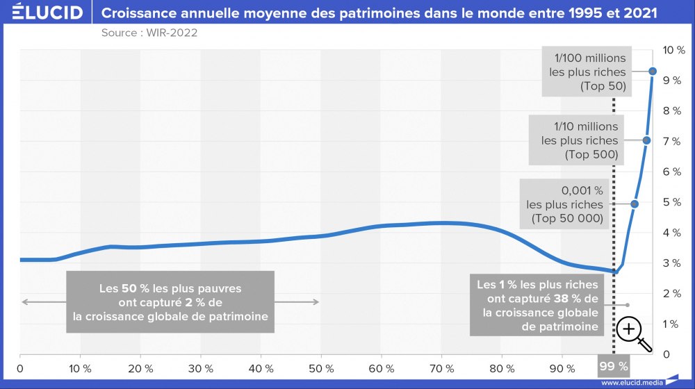 On constate sur ce graphique que globalement, plus quelqu’un est riche, plus la rentabilité de son capital est élevée. La baisse de rendement observée au niveau des 90 % les plus riches est liée au fait que cette analyse est mondiale ; au niveau d’un pays, la courbe devrait être croissante.