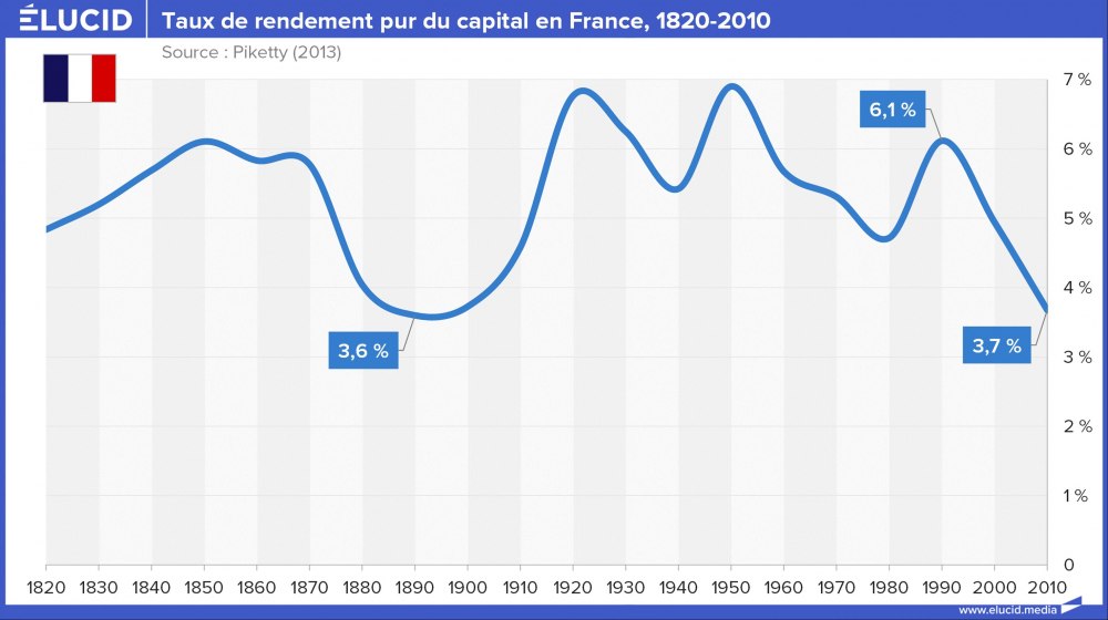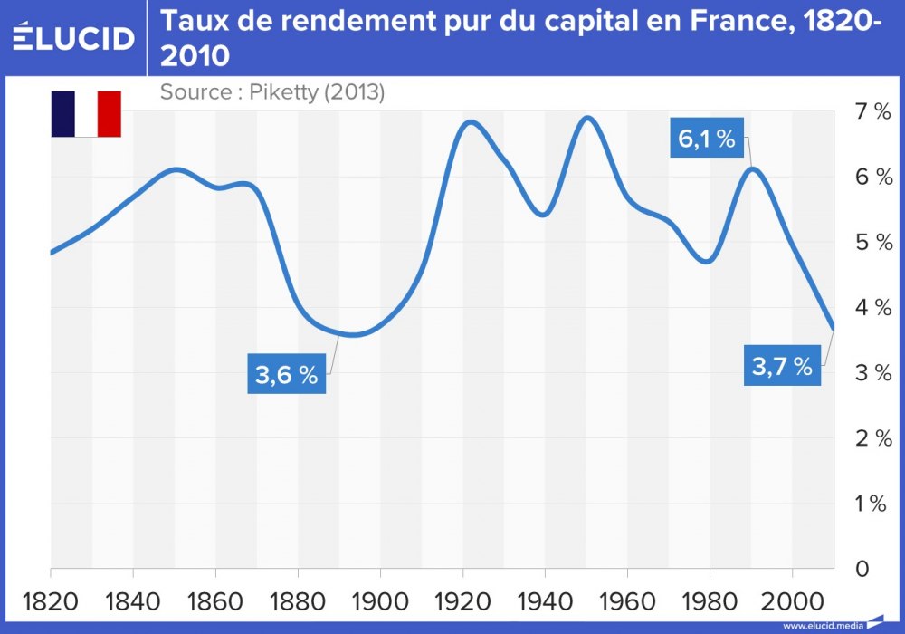 On constate que le rendement pur du capital en France a eu tendance à se situer entre 4 % et 6 % par an (en plus de l’inflation). C’est évidemment bien plus que le taux d’intérêt réel des obligations publiques, les investisseurs plaçant une partie importante de leurs avoirs sur des actifs plus risqués et donc plus rémunérateurs.