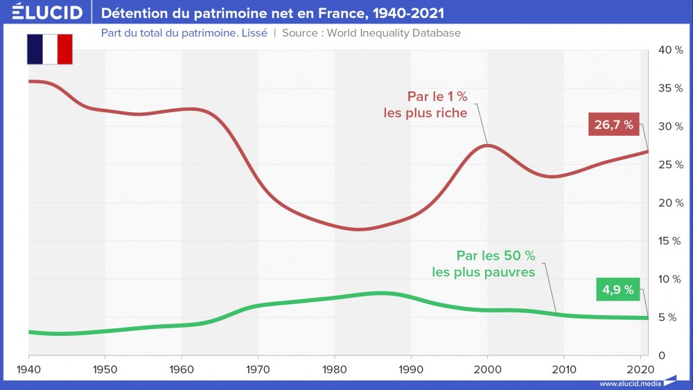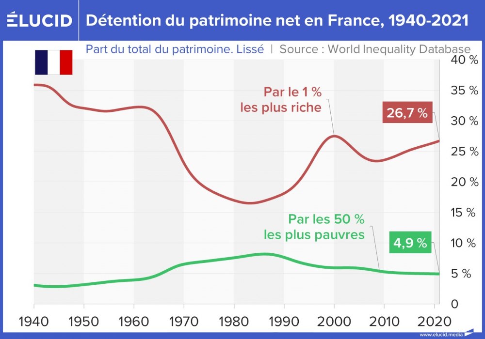Cette différence de rendement est fondamentale : c’est ce qui explique l’enrichissement continu des capitalistes, puisque les politiques fiscales des 30 Glorieuses ont cessé de corriger cette inégalité structurelle. La part du patrimoine détenu par les plus riches augmente donc sans cesse, creusant ces inégalités :