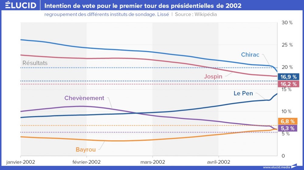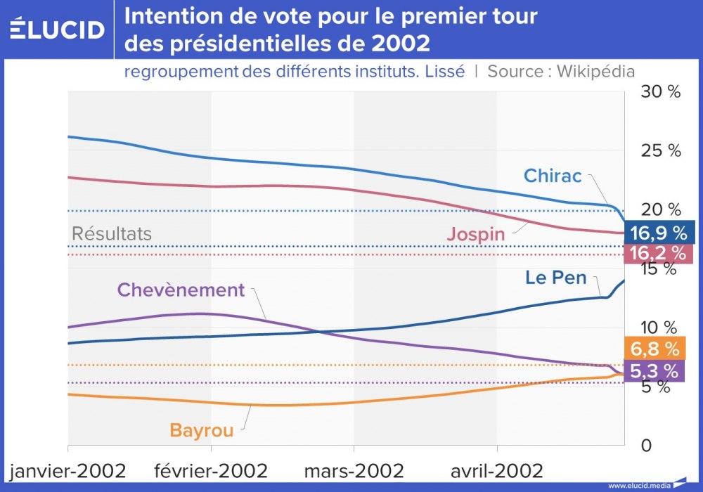 La présidentielle de 2002 avait marqué les esprits en raison de la qualification surprise de Jean-Marie Le Pen au second tour de la présidentielle au détriment du candidat socialiste Lionel Jospin. Tous les sondages annonçaient pourtant la qualification de ce dernier avec une confortable marge d’avance sur son poursuivant d’extrême droite, y compris dans les dernières semaines précédant le premier tour. L’efficacité des sondages d’opinion avait été fortement remise en cause à ce moment.