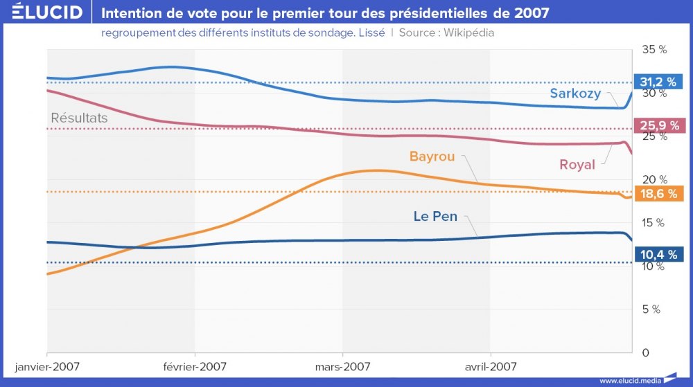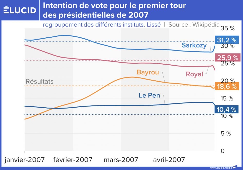 La présidentielle de 2007 a, à l’inverse, marqué une surestimation du vote Le Pen entre février et avril 2007 par rapport à son score final au premier tour. Les candidats Ségolène Royal (PS) et Nicolas Sarkozy (UMP) ont quant à eux réalisé un score légèrement supérieur à ce que prédisaient les derniers sondages électoraux. Néanmoins, l’ordre d’arrivée des candidats a été relativement conforme à ce qu’anticipaient les instituts de sondages.