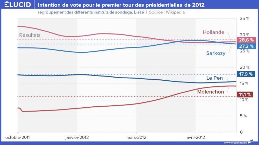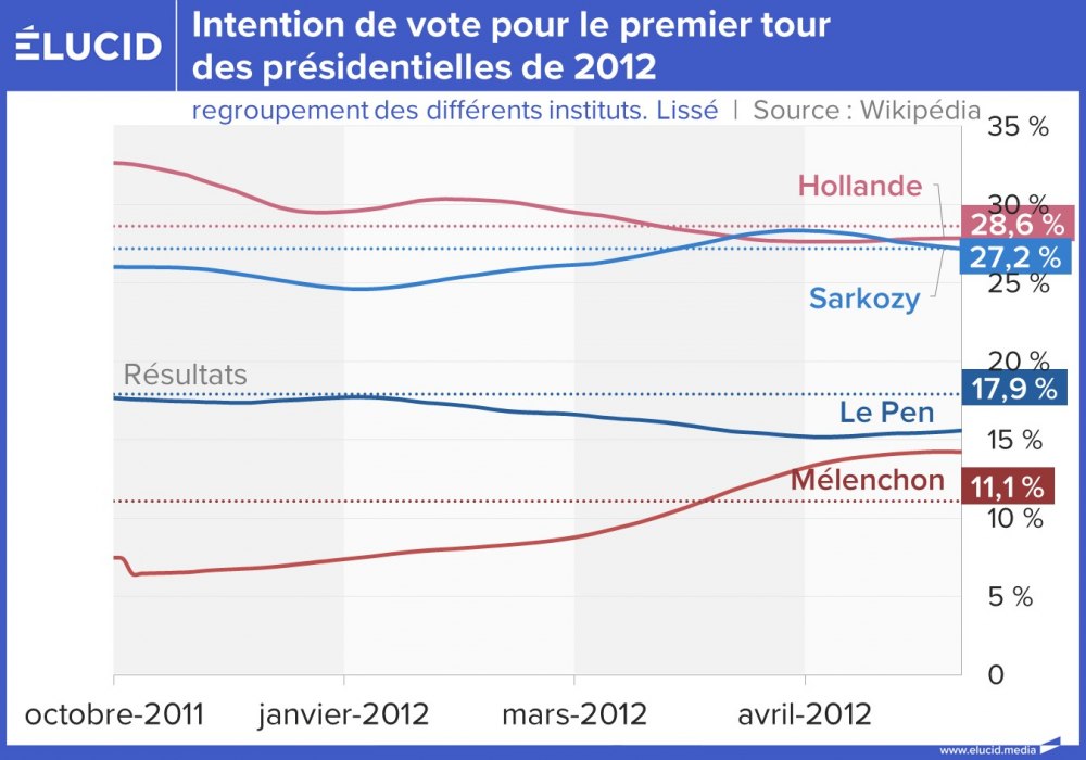 La présidentielle de 2012 tranche en revanche avec celle de 2007 en particulier en ce qui concerne les votes « radicaux » autour de Marine Le Pen et de Jean-Luc Mélenchon. En effet, alors que les sondages annonçaient entre mars et avril 2012 un « quasi-croisement des courbes » entre Jean-Luc Mélenchon et Marine Le Pen c’est finalement l’extrême droite qui réalisera le score le plus important.