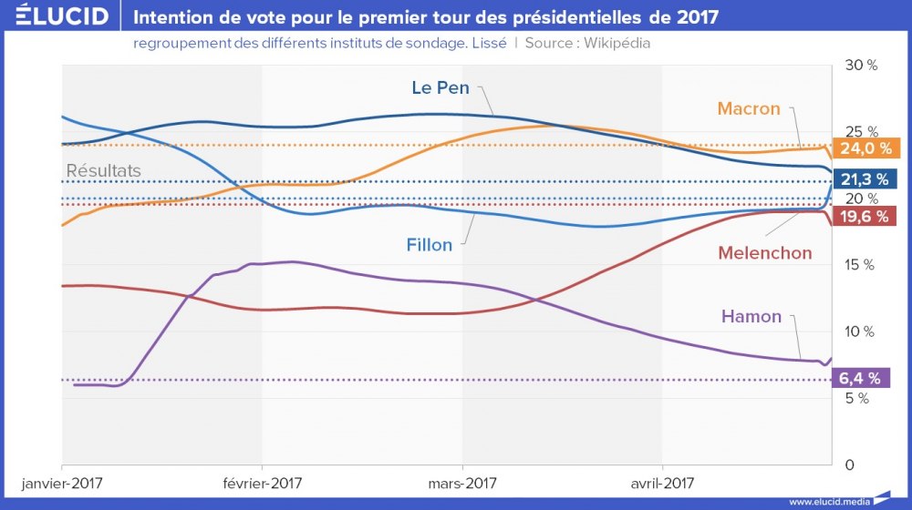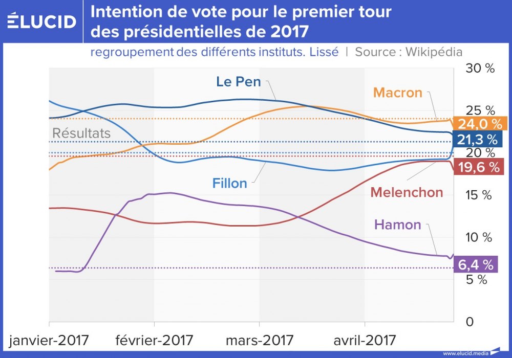 La présidentielle de 2017 a marqué un regain de crédibilité pour les sondages qui ont permis d’annoncer relativement fidèlement l’ordre d’arrivée des 4 plus important des candidats, mais également leurs scores au premier tour. Le score de Marine Le Pen avait été légèrement surestimé dans les toutes dernières enquêtes (24 avril 2017) tandis que celui de Jean-Luc Mélenchon était légèrement sous-estimé.