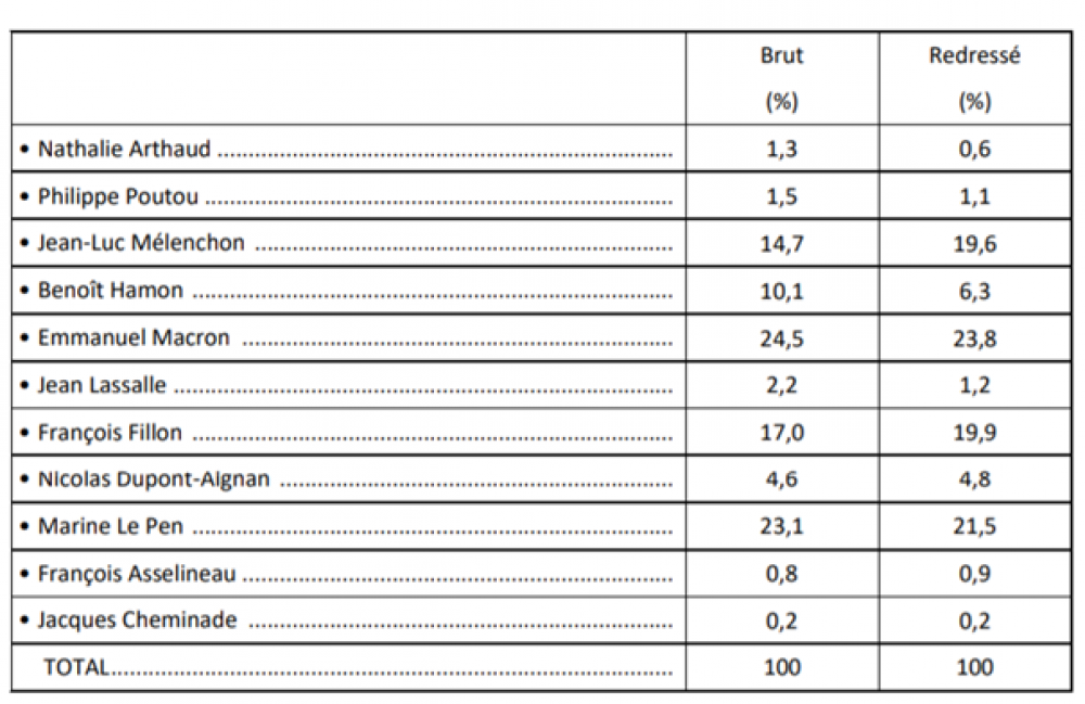 Redressement effectué par l’IFOP en fonction du vote au premier tour de l'élection présidentielle de 2017 - Source