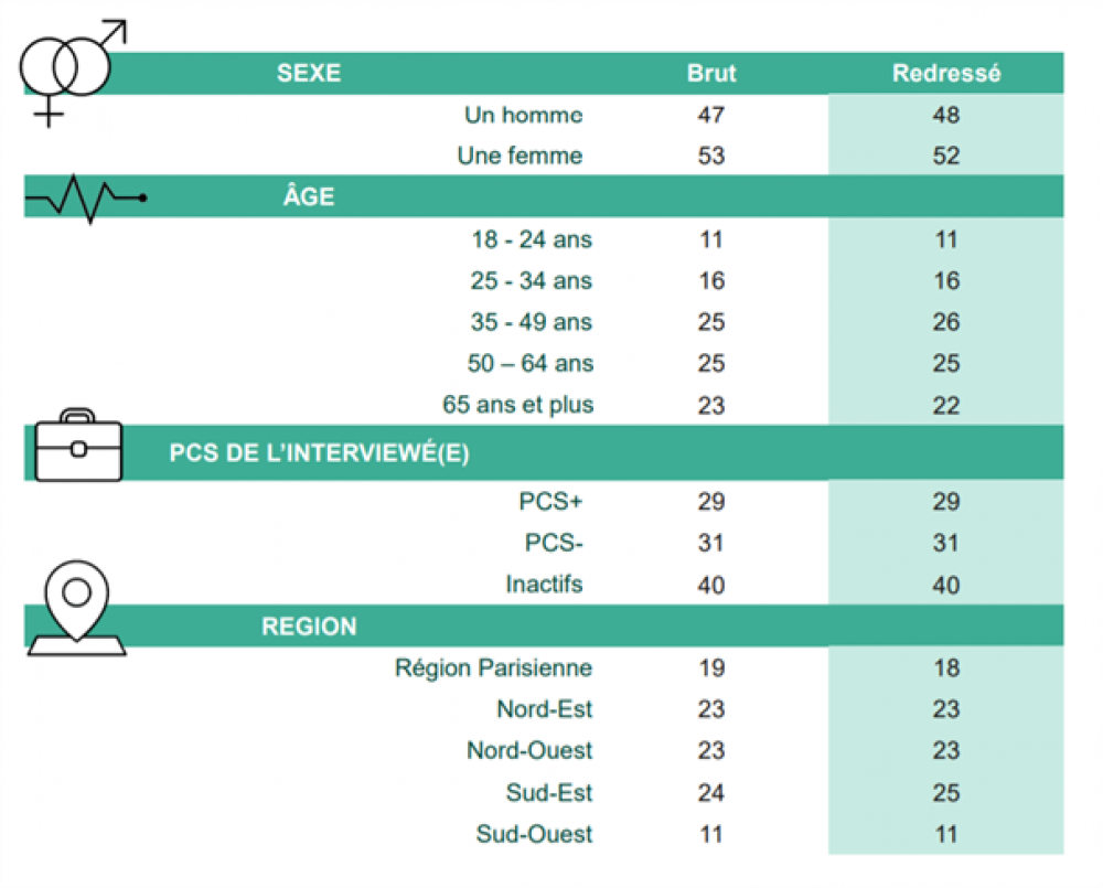 Variables de contrôle pour la réalisation du sondage Harris Interactive du 8 décembre 2021. La colonne « brut » correspond aux caractéristiques de l’échantillon et la colonne « redressé » à celles de la population totale.