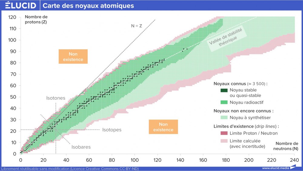 Les physiciens ont l’habitude de représenter les noyaux sur un graphique, qui les distribue en fonction du nombre de protons et de neutrons qu’ils contiennent – c’est le diagramme de Ségré, communément appelé carte des noyaux, ou carte des isotopes ou encore carte des nucléides.