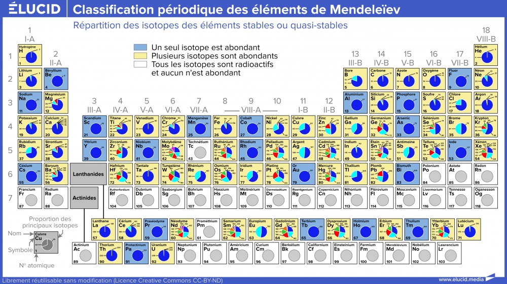 Il est également possible de représenter sur le tableau de Mendeleïev la répartition entre les isotopes pour tous les éléments stables ou quasi-stables.