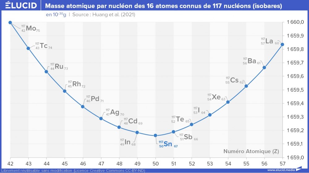 En termes plus simples, cela signifie que la masse de tous les atomes ayant le même nombre de nucléons se distribue toujours selon une parabole, dont le point le plus bas sera le noyau le plus stable de ces isobares. Et c’est bien ce que l’on constate : par exemple, de tous les noyaux de 117 nucléons, c’est l’étain-117 qui est le plus léger, donc le plus solidement lié. Ce métal ayant 50 protons, on a une nouvelle illustration des nombres magiques : l’étain est même l’élément chimique qui a le plus d’isotopes stables, à savoir dix.