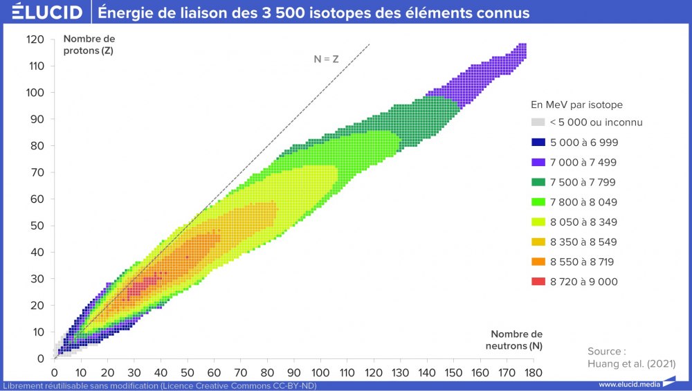 Et enfin, la carte des énergies de liaison par nucléon (qui est en fait la représentation inverse de la précédente, masse et énergie étant inversement liées) :