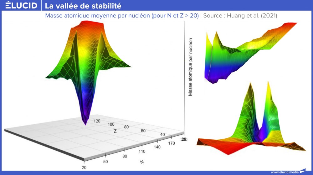 En combinant les trois graphes précédents, on obtient une vision en trois dimensions (selon un axe N neutron, un axe Z proton et un axe pour la masse) représentée sur le graphique ci-dessous par une vue de face, de coupe et « de dessus ». La « vallée de stabilité » que l’on voit ainsi apparaître est semblable à une vue en trois dimensions d’une vallée dont le fond serait parcouru par une « rivière » composée uniquement de noyaux stables.