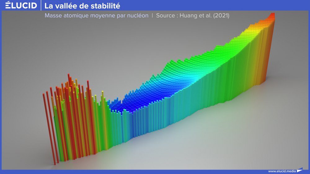 Si l’on généralise cette présentation pour l’ensemble des éléments atomiques, nous allons voir apparaître une « vallée de la stabilité » avec les éléments les plus stables dans le creux de la vallée et les éléments les plus instables sur les pentes de celle-ci. Pour construire cette représentation en 3D, il faut mobiliser 3 graphiques différents :
