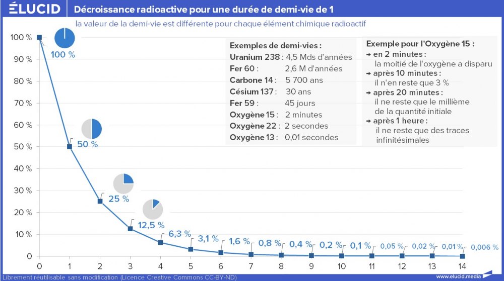 On appelle « demi-vie » (aussi dénommée période radioactive) la durée au bout de laquelle la moitié des atomes radioactifs ont disparu. Elle varie de quelques microsecondes à des milliards de milliards d’années (pour le Tellure 128 ou Bismuth 209 par exemple). La quantité d’un isotope radioactif est ainsi divisée par environ 1 000 toutes les 10 demi-vies.