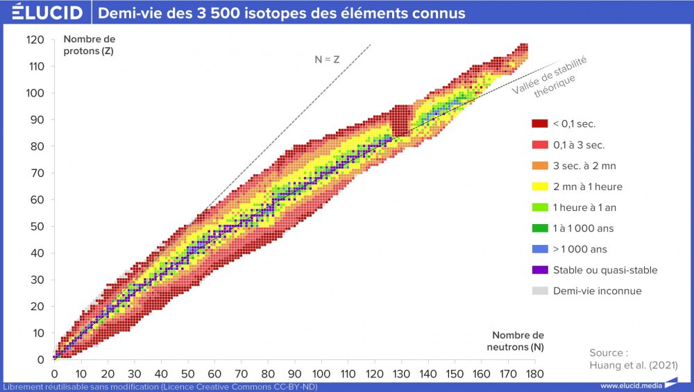 On observe ainsi que plus un isotope s’éloigne de la vallée de stabilité (zone violette), plus il tend à être instable et donc à avoir une courte demi-vie.