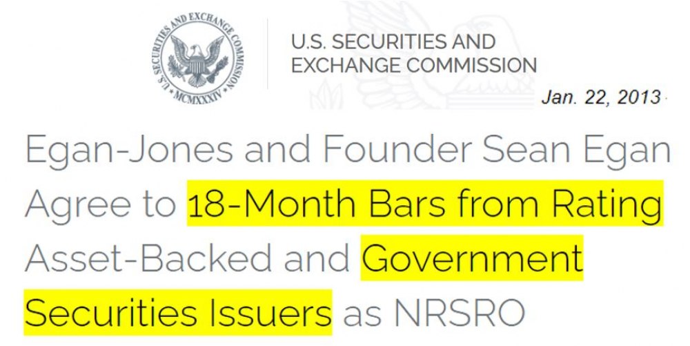 Le 12 septembre 2012, l’agence dégrada de nouveau la dette américaine à AA- en raison du lancement des opérations de planche à billets. Le 22 janvier 2013, le contentieux avec les autorités fut résolu par un accord amiable sur le paiement d’une amende et une interdiction pour l’agence de noter des États pendant 18 mois. Le message a été entendu : l’agence Egan-Jones a ensuite repris ses notations... à l’exception des États-Unis qu’elle ne note plus depuis 2013.