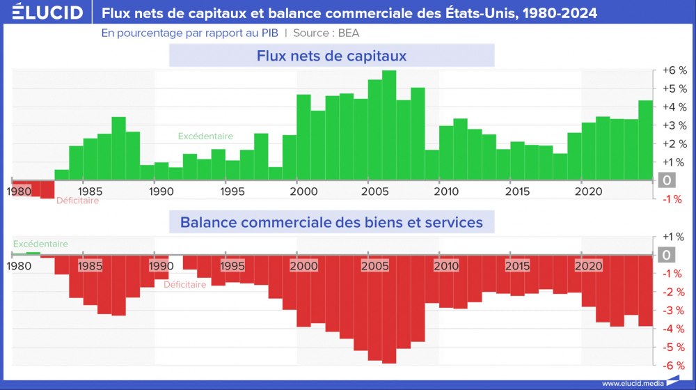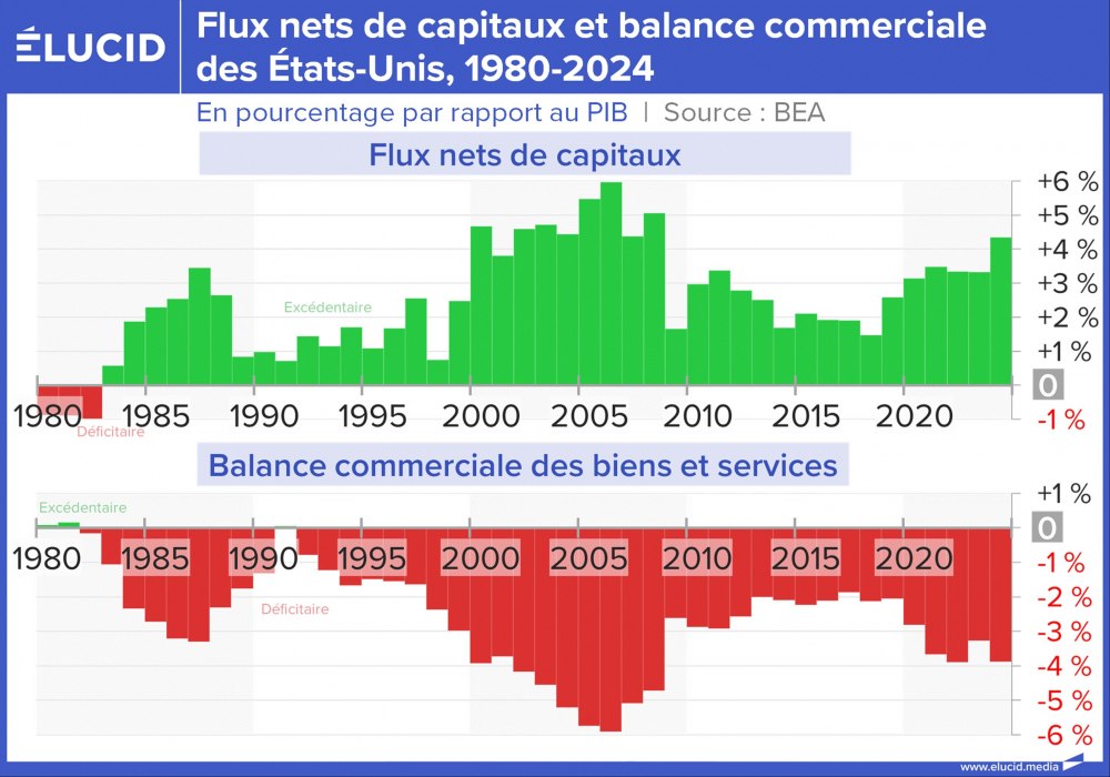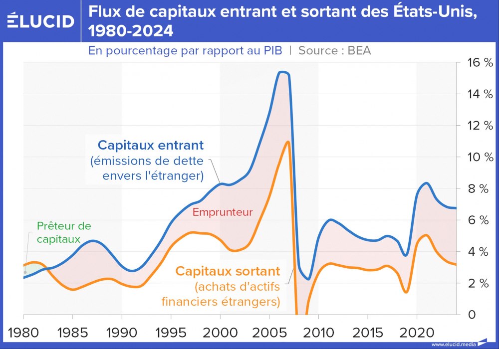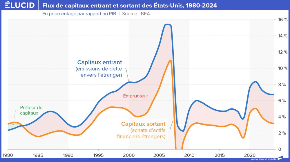 L’observation des flux de capitaux raconte l’histoire économique américaine depuis plus de 40 ans, qui a précipité le pays vers le mur actuel. La fin des accords de Bretton Woods et la dérive financière qui a suivi a entraîné le retour d’une forte inflation, et donc des taux d’intérêts élevés, qui ont attiré, au début des années 1980, les capitaux étrangers aux États-Unis.