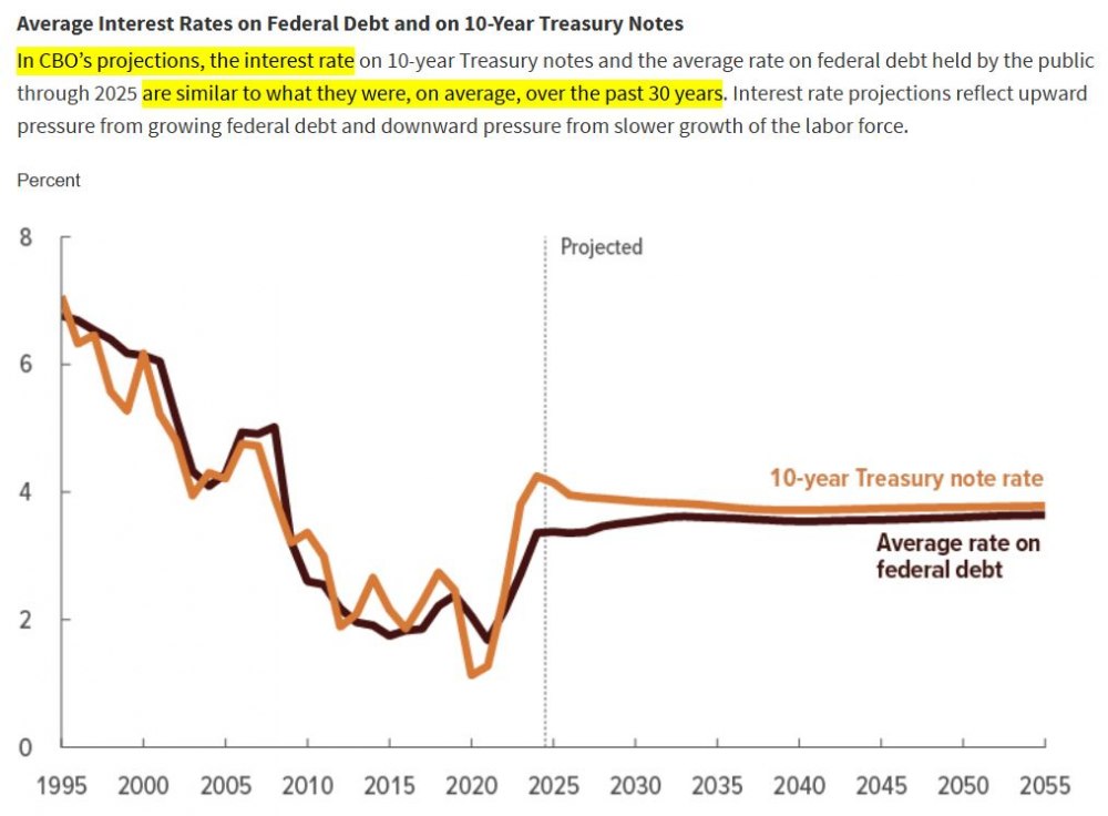 Et ces résultats, très inquiétants, se basent sur une hypothèse assez risible, de taux d’intérêt futurs des États-Unis qui restent constants à moins de 4 %, ce taux étant « la moyenne des 30 dernières années ». Certes, mais c’est un taux qui correspond à un niveau de dette passé, et pas à une gestion où le gouvernement semble avoir perdu le contrôle…