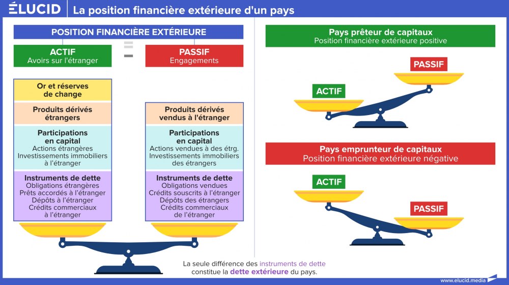 Comme les déficits commerciaux annuels perdurent, la dette envers l’étranger ne cesse de croître. Il est donc important de mesurer, à un moment donné, le montant du stock de tous les actifs (appelés aussi avoirs : crédits, investissements directs, investissements immobiliers des résidents…) et de toutes les passifs (appelés aussi engagements : dettes, investissements des étrangers…) d’un pays envers l’étranger. La différence des deux constitue ce qu’on appelle la position financière extérieure du pays (ou le bilan net des investissements internationaux du pays).