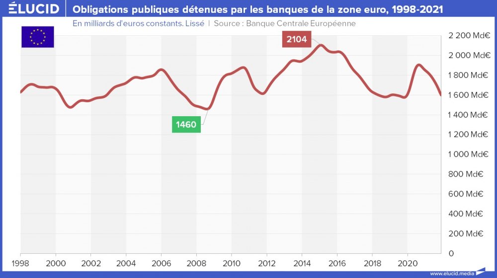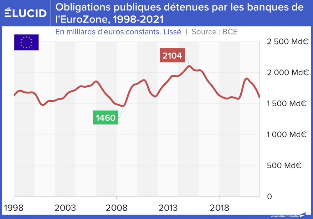 Durant la crise sanitaire de 2020, la Banque centrale européenne a mis en place un programme d’achats de titres d’urgence (PEPP) — pour un montant total de 1850 milliards d’euros — afin de faciliter le financement des banques de la zone euro. Avec ces liquidités, ces dernières ont investi dans les obligations publiques des États européens. Le montant global d’obligations publiques détenues par les banques de la zone euro est ainsi passé de 1 575 à 1 900 milliards d’euros entre novembre 2019 et septembre 2020. À partir d’octobre 2020, il a recommencé à diminuer et s’établit à 1600 milliards d’euros en décembre 2021.