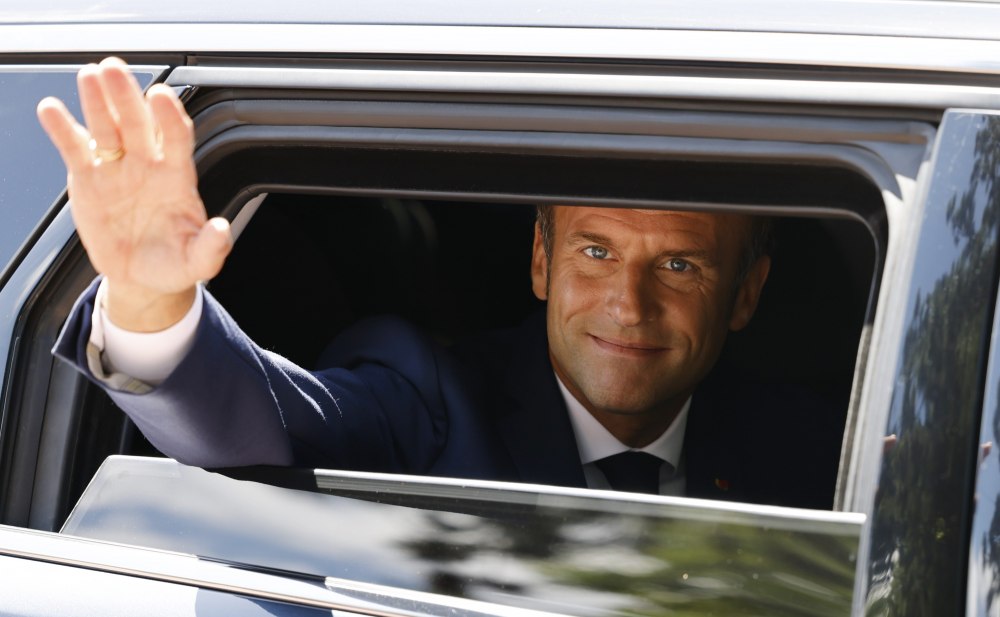 Emmanuel Macron salue après avoir voté aux élections législatives françaises dans un bureau de vote au Touquet, 12 juin 2022 - Ludovic Marin - @AFP