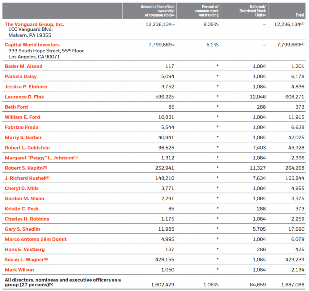 En outre, les rapports annuels d’aujourd’hui sont devenus de véritables labyrinthes, dans lesquels il est difficile de trouver ce type d’informations. Pour BlackRock par exemple, l’information sur les actionnaires ne figure pas dans son rapport annuel, mais dans le « proxy statement » qui l’accompagne. Les informations sur les actionnaires figurent à la page 51 de ce document.