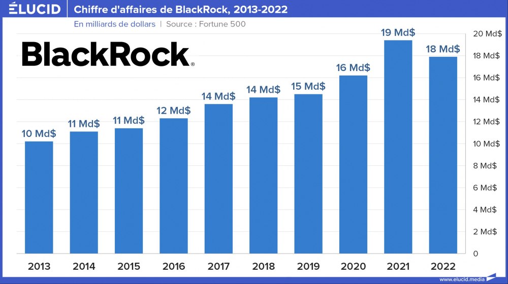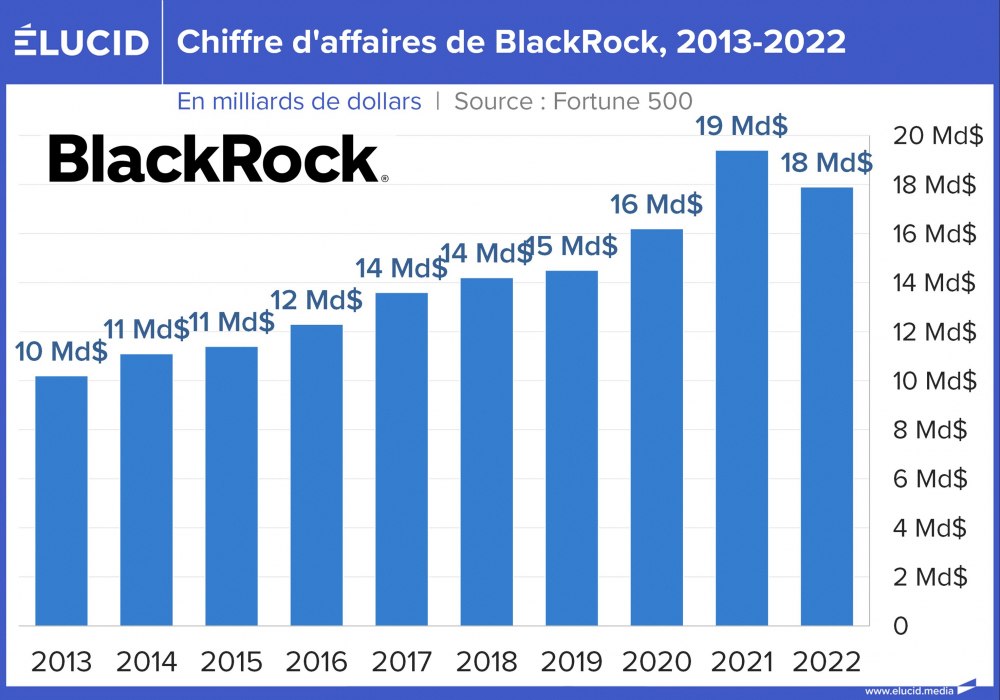En une décennie, BlackRock – dont nous expliquions plus haut que les fonds ont largement profité de la planche à billets américaine depuis 2009 – a vu son chiffre d’affaires quasi doubler, passant de 10 à environ 19 milliards de dollars. La firme a dégagé 5 milliards de bénéfice net en 2022, et 6 milliards en 2021.