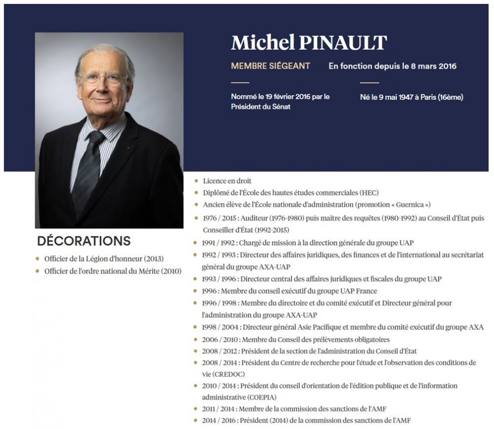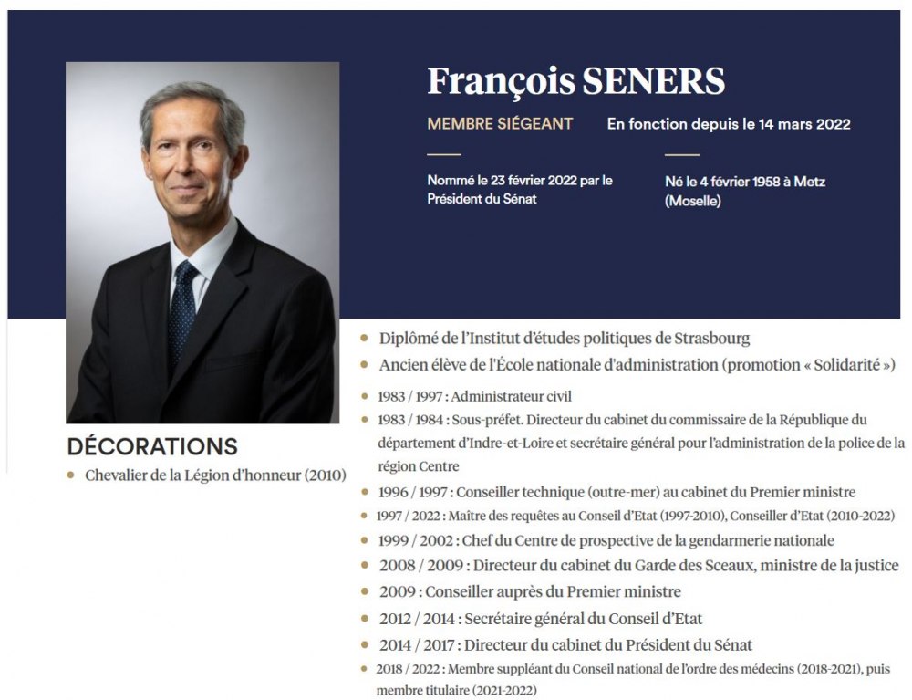 Cet énarque diplômé d’HEC a alterné les fonctions au sein du Conseil d’État et dans le privé et la finance. Aucune expérience particulière en Droit constitutionnel.