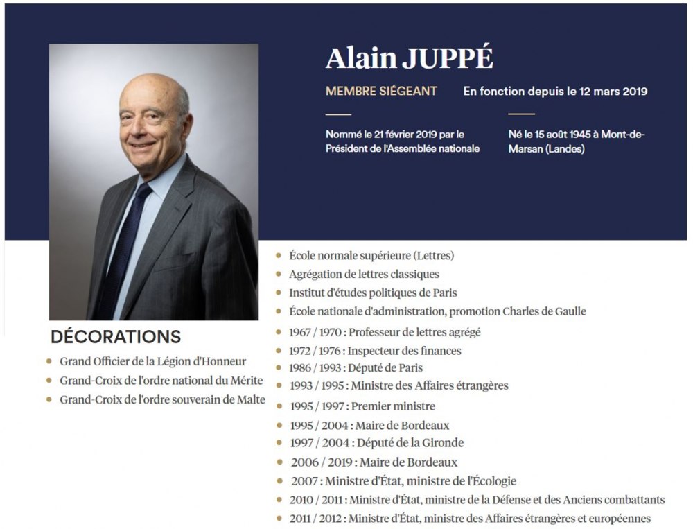 Le doyen du Conseil est un autre énarque ancien Premier ministre. Agrégé de lettres classiques, il complète ainsi parfaitement les connaissances de Laurent Fabius, agrégé de lettres modernes. Son CV omet de préciser qu'il a été condamné pour "prise illégale d'intérêts" à 14 mois de prison avec sursis et 1 an d'inéligibilité en appel (contre 18 mois et 10 ans en première instance) dans l'affaire des emplois fictifs de la mairie de Paris. Aucune expérience particulière en Droit constitutionnel. Son expérience de ministre des Affaires étrangères et de maire de Bordeaux l’aidera (peut-être…) pour ses fonctions en lien avec le Droit constitutionnel. Point positif : cette nomination l’empêche de détruire un pays arabe de plus.