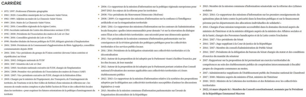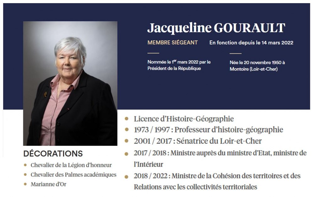 Comme le font souvent les imposteurs atteignant un poste à responsabilité dont ils n’ont pas les compétences nécessaires, Jacqueline Gourault s’est sentie obligée de rédiger le plus long CV du Conseil Constitutionnel, rempli d’informations très intéressantes pour la tenue de son poste, telles que « 2017 : Administratrice suppléante de l'établissement public du Domaine national de Chambord ». Du très lourd donc.