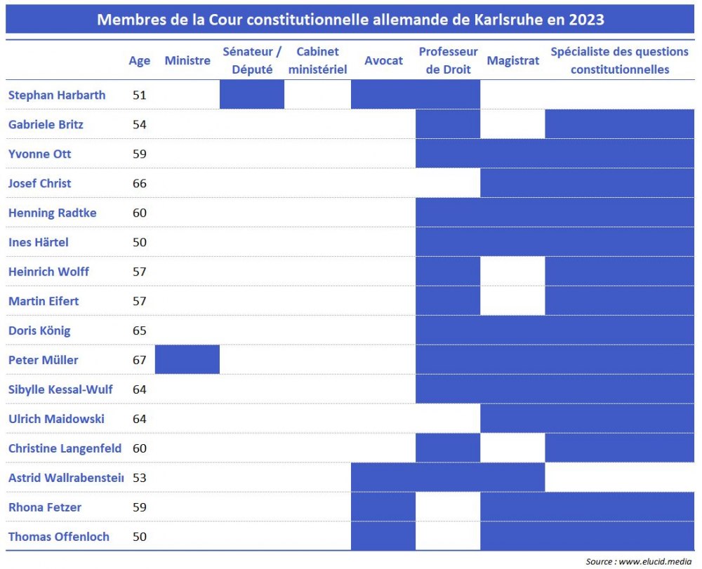 Tous doivent avoir une expérience judiciaire et être approuvés par 67 % des parlementaires, 6 sur 16 doivent avoir siégé dans une des Cours suprêmes, tous doivent avoir moins de 68 ans, ce qui fait que, au minimum, 7 membres du Conseil constitutionnel français sur 9 n’ont pas le droit d’être membres de la Cour constitutionnelle allemande. Si on rajoute l'expérience, il est probable qu'aucun membre du Conseil constitutionnel français ne serait désigné en Allemagne.