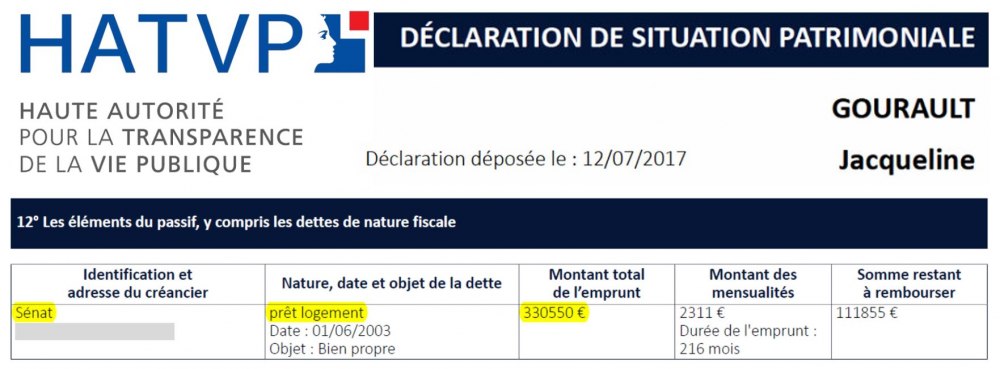 On ne connait donc que ceux des anciens ministres, comme Jacqueline Gourault. La politique aura a priori payé plus que l’éducation nationale, vu qu’elle est millionnaire, même en tenant compte du fait qu’elle doit « rembourser plus de 100 000 € sur un prêt [de 330 000 €] contracté auprès du Sénat pour acheter un logement. » Vous aussi, si vous avez des problèmes à obtenir un crédit immobilier, contactez le Sénat, c’est une banque a priori super accommodante.